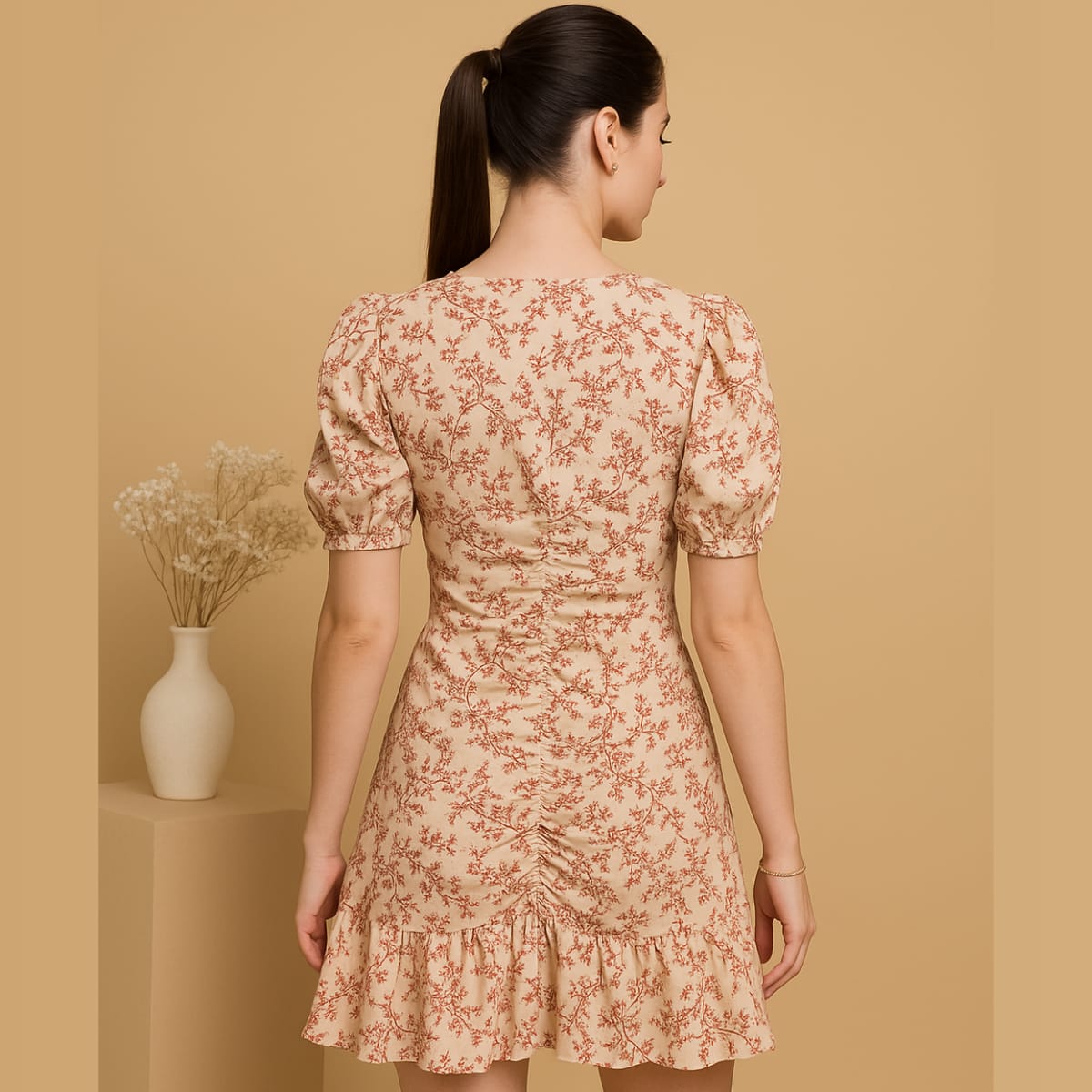 This charming fit-and-flare dress features a soft beige base adorned with delicate rust-red floral prints, offering a fresh, feminine look perfect for daywear or casual gatherings. The dress showcases puffed half sleeves and a flattering round neckline, while the rushed detailing along the waist enhances the silhouette with a comfortable, figure-flattering fit. A subtle ruffle hem adds playful movement to the skirt, creating a graceful flow with each step. Crafted from lightweight, breathable fabric, this dress ensures all-day comfort while maintaining effortless style. Pair it with heels or flats to complete a versatile, elegant look suitable for brunches, vacations, and casual outings.